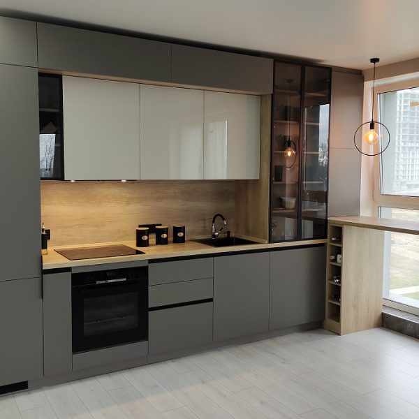 В кухне использованы - Петли Clip Top_Blumotion, ДСП-цоколь, Багет Массив Ясень Б-3K_цв.111, ДСП потолок Древесина Аттик, Стекло СТ-9_Золото на графите прозрачное, карго, Система выдвижных ящиков InnoTech