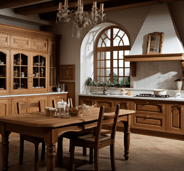 Мебель из натурального дерева всегда выглядит очень роскошно и эффектно, в каком бы стиле она ни была изготовлена. Ее можно использовать для оформления маленьких и больших помещений, придавая индивидуальность кухне не только за счет предметов гарнитура, но и с помощью подобранных к нему аксессуаров и других элементов интерьера, например, карнизов