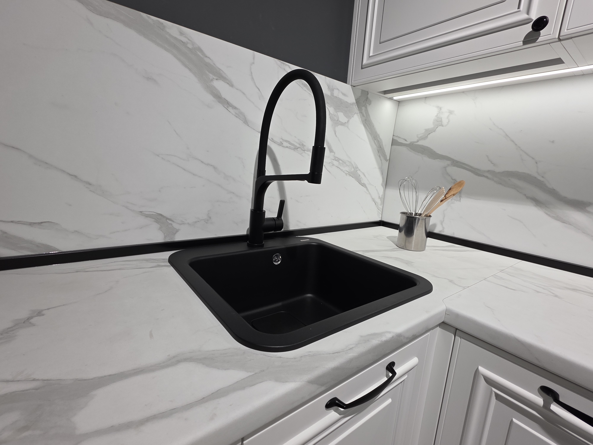 Кухня «Анжуна» с фасадами из МДФ массив крашенный. В роли фурнитуры выступает продукция известного немецкого производителя Hettich и австрийского производителя Blum. Мягкая цветовая палитра в светлых тонах хорошо подойдет как для просторных помещений, так и для небольших кухонь. Гарнитур позволяет использовать встраиваемую технику.